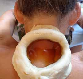 1. Preparation: The individual lies face down on a massage table or flat surface. A dough made from a mixture of flour and water is prepared and shaped into a circular dam, which is then placed around the lower back area, covering the lumbar spine and surrounding muscles.